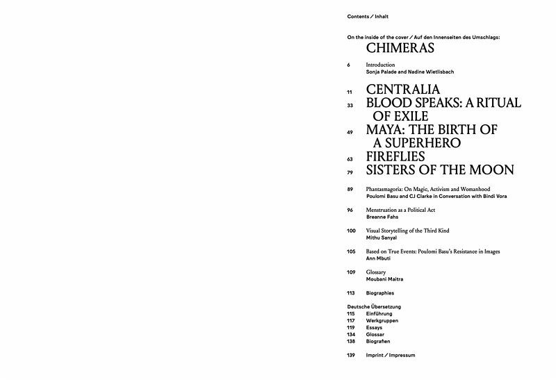 Phantasmagoria gibt erstmals einen Überblick über zentrale Werkgruppen und erscheint im Rahmen von Poulomi Basus erster institutioneller Einzelausstellung im Fotomuseum Winterthur. Essays der Wissenschaftlerin Breanne Fahs, der Kulturpublizistin und Journalistin Ann Mbuti und der Autorin und Kulturwissenschaftlerin Mithu Sanyal analysieren Basus Arbeit aus verschiedenen Blickwinkeln. In einem Gespräch mit der Kuratorin Bindi Vora spricht die Künstlerin über Selbstliebe als emanzipatorische Praxis, Menstruation als politischen Akt und das Konzept der Doku-Fiktion. Ein Glossar der indischen Soziologin Moubani Maitra kontextualisiert zentrale Begriffe und bietet einen weiteren Zugang zu Werk und Schwerpunkten von Poulomi Basu.