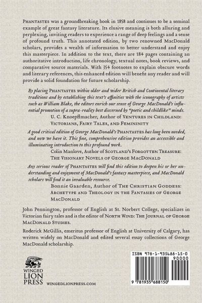 Phantastes was a groundbreaking book in 1858 and continues to be a seminal example of great fantasy literature. Its elusive meaning is both alluring and perplexing, inviting readers to experience a range of deep feelings and a sense of profound truth. This annotated edition, by two renowned MacDonald scholars, provides a wealth of information to better understand and enjoy this masterpiece. In addition to the text, there are 184 pages containing an authoritative introduction, life chronology, textual notes, book reviews, and comparative source materials. With 354 footnotes to explain obscure words and literary references, this enhanced edition will benefit any reader and will provide a solid foundation for future scholarship. "By placing Phantastes within older and wider British and Continental literary traditions and by establishing this text's affinities with the iconography of artists such as William Blake, the editors enrich our sense of George MacDonald's influential promotion of a supra-reality best discerned by "poetic and childlike" minds." U. C. Knoepflmacher, Author of Ventures in Childland: Victorians, Fairy Tales, and Femininity "A good critical edition of George MacDonald's Phantastes has long been needed, and now we have it. This fine, comprehensive edition provides an accessible and illuminating introduction to this profound work." Colin Manlove, Author of Scotland's Forgotten Treasure: The Visionary Novels of George MacDonald Any serious reader of Phantastes will fi nd this edition to deepen his or her understanding and enjoyment of MacDonald's fantasy masterpiece, and MacDonald scholars will find it an invaluable resource. Bonnie Gaarden, Author of The Christian Goddess: Archetype and Theology in the Fantasies of George MacDonald John Pennington, professor of English at St. Norbert College, specializes in Victorian fairy tales and is the editor of North Wind: The Journal of George MacDonald Studies. Roderick McGillis, emeritus professor of English at University of Calgary, has written widely on MacDonald and edited several essay collections of George MacDonald scholarship.