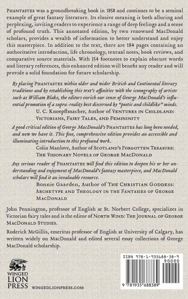 Phantastes was a groundbreaking book in 1858 and continues to be a seminal example of great fantasy literature. Its elusive meaning is both alluring and perplexing, inviting readers to experience a range of deep feelings and a sense of profound truth. This annotated edition, by two renowned MacDonald scholars, provides a wealth of information to better understand and enjoy this masterpiece. In addition to the text, there are 184 pages containing an authoritative introduction, life chronology, textual notes, book reviews, and comparative source materials. With 354 footnotes to explain obscure words and literary references, this enhanced edition will benefit any reader and will provide a solid foundation for future scholarship. "By placing Phantastes within older and wider British and Continental literary traditions and by establishing this text's affinities with the iconography of artists such as William Blake, the editors enrich our sense of George MacDonald's influential promotion of a supra-reality best discerned by "poetic and childlike" minds." U. C. Knoepflmacher, Author of Ventures in Childland: Victorians, Fairy Tales, and Femininity "A good critical edition of George MacDonald's Phantastes has long been needed, and now we have it. This fine, comprehensive edition provides an accessible and illuminating introduction to this profound work." Colin Manlove, Author of Scotland's Forgotten Treasure: The Visionary Novels of George MacDonald Any serious reader of Phantastes will fi nd this edition to deepen his or her understanding and enjoyment of MacDonald's fantasy masterpiece, and MacDonald scholars will find it an invaluable resource. Bonnie Gaarden, Author of The Christian Goddess: Archetype and Theology in the Fantasies of George MacDonald John Pennington, professor of English at St. Norbert College, specializes in Victorian fairy tales and is the editor of North Wind: The Journal of George MacDonald Studies. Roderick McGillis, emeritus professor of English at University of Calgary, has written widely on MacDonald and edited several essay collections of George MacDonald scholarship.