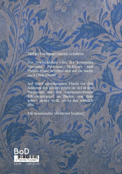 Tief im Dschungel lauern GefahrenDas Dorfmädchen Gini, der Kronprinz Maximus, Professor McKinsey und Phönix Flame begeben sich auf die Suche nach Ginis Eltern. Auf der Flucht vor den Soldaten des Königs gehen sie tief in den Dschungel um den sagenumwobenen Elfenbeintempel zu finden, von dem keiner sicher weiß, ob es ihn wirklich gibt.Ein spannendes Abenteuer beginnt!