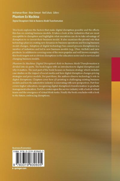Phantom Ex Machina: Digital Disruption's Role in Business Model Transformation is divided into six parts. The book begins with an introduction to digital disruption and why it matters. The nextpart of the book focuses on business strategy which includes case studies on the impact of social media and how digital disruption changes pricing strategies and price models. For part three, the authors observe technology's role in digital disruptions. Chapters cover how 3D printing is challenging existing business models and how the automotive industry is innovating with new perspectives. Part four covers higher education, recognizing digital disruption's transformation in graduate management education. Part five centers upon the service industry with a look at virtual teams and the emergence of virtual think tanks. Finally the book concludes with a look to the future, embracing disruptions.