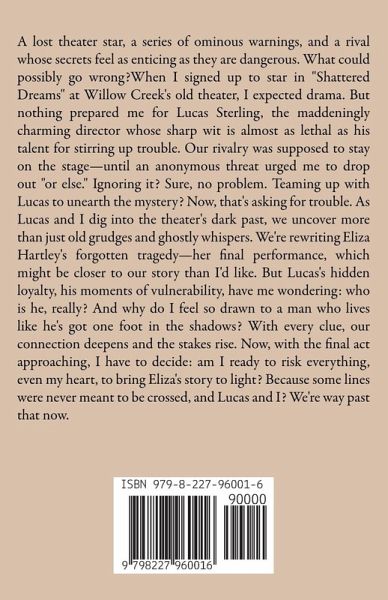 A lost theater star, a series of ominous warnings, and a rival whose secrets feel as enticing as they are dangerous. What could possibly go wrong?When I signed up to star in "Shattered Dreams" at Willow Creek's old theater, I expected drama. But nothing prepared me for Lucas Sterling, the maddeningly charming director whose sharp wit is almost as lethal as his talent for stirring up trouble. Our rivalry was supposed to stay on the stage-until an anonymous threat urged me to drop out "or else." Ignoring it? Sure, no problem. Teaming up with Lucas to unearth the mystery? Now, that's asking for trouble. As Lucas and I dig into the theater's dark past, we uncover more than just old grudges and ghostly whispers. We're rewriting Eliza Hartley's forgotten tragedy-her final performance, which might be closer to our story than I'd like. But Lucas's hidden loyalty, his moments of vulnerability, have me wondering: who is he, really? And why do I feel so drawn to a man who lives like he's got one foot in the shadows? With every clue, our connection deepens and the stakes rise. Now, with the final act approaching, I have to decide: am I ready to risk everything, even my heart, to bring Eliza's story to light? Because some lines were never meant to be crossed, and Lucas and I? We're way past that now.