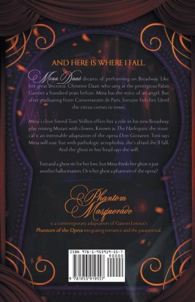 And here is where I fall. Mina Daaé dreams of performing on Broadway. Like her great ancestor, Christine Daaé, who sang at the prestigious Palais Garnier a hundred years before, Mina has the voice of an angel. But after graduating from Conservatoire de Paris, fortune fails her. Until the circus comes to town. Mina's close friend Toni Vollini offers her a role in his new Broadway play mixing Mozart with clowns. Known as The Harlequin, the musical is an inimitable adaptation of the opera Don Giovanni. Toni says Mina will soar, but with pathologic acrophobia, she's afraid she'll fall. And the ghost in her head says she will. Toni and a ghost vie for her love, but Mina thinks her ghost is just another hallucination. Or is her ghost a phantom of the opera? Phantom Masquerade is a contemporary adaptation of Gaston Leroux's Phantom of the Opera integrating romance and the paranormal.