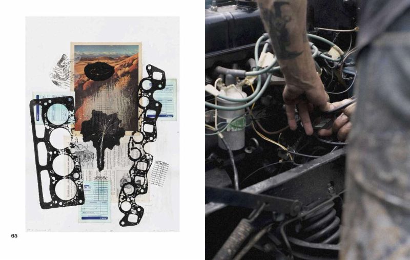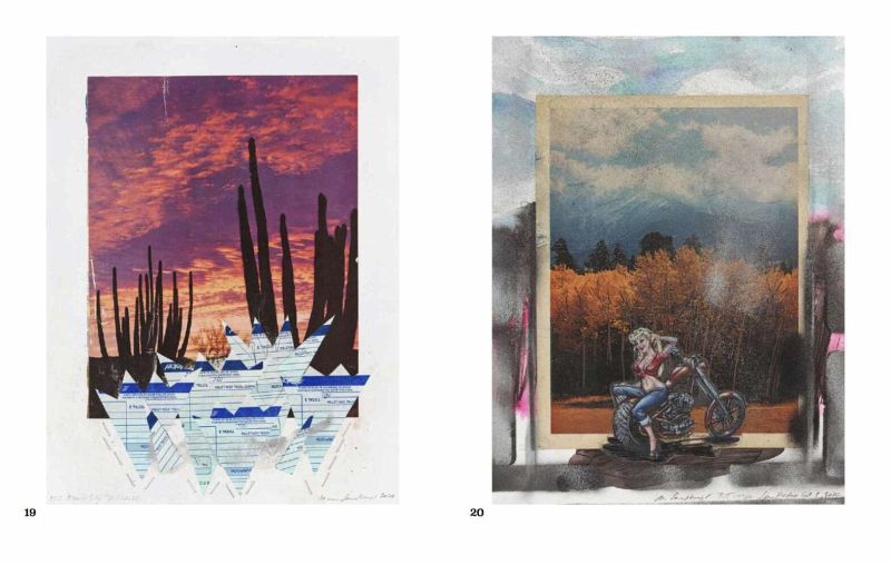 Diary of a Vagabond The painter, musician, and sculptor Marcus Sendlinger (b. Königstein im Taunus, Germany, 1967; lives and works in Lentzke) collages, abstracts, and recontextualizes relics of urban life he collects on his travels. Pictures of sunsets, palm trees, or mountain landscapes figure in collages together with shady advertisements, newspaper clippings, or hotel bills. The humdrum of daily life and the real world are the source of inspiration for Sendlinger's process-based works, which combine silkscreen printing and collage with painting for a meditation on an age of overwrought excess between irremediable decline and advancing hypermodernity. A traveling artist, he celebrates an ambivalence between romanticism and bottomless despair that inhabits his works and entrusts his gathered insights to the beholder's critical eyes. The publication Phantom Ride presents collages and sculptures from the past three years to chart a journey through cities and peripheries dotted with traces of a promise of freedom. Tagebuch eines Vagabunden Der Maler, Musiker und Bildhauer Marcus Sendlinger (geb. 1967 in Königstein im Taunus, lebt und arbeitet in Lentzke) collagiert, abstrahiert und rekontextualisiert Relikte des urbanen Lebens, die er auf seinen Reisen sammelt. Bilder von Sonnenuntergängen, Palmen oder Gebirgslandschaften collagiert der Künstler mit dubiosen Werbeanzeigen, Zeitungsausschnitten oder Hotelrechnungen. Der banale Alltag und die reale Welt sind die Inspirationsquelle für Sendlingers prozesshafte Arbeiten, in denen er Siebdruck und Collage mit Malerei verbindet. Er kommentiert damit eine Zeit des überdrehten Überflusses zwischen hoffnungslosem Verfall und fortschreitender Hypermodernität. Als reisender Künstler zelebriert er dabei eine Ambivalenz zwischen Romantik und Abgrund, die seinen Werken innewohnt, und vertraut dem kritischen Blick der Betrachter_innen. Die Publikation Phantom Ride ist eine Reise durch Städte und Peripherien, in denensich die Spuren einer versprochenen Freiheit finden, und zeigt Collagen sowie Skulpturen aus den letzten drei Jahren.