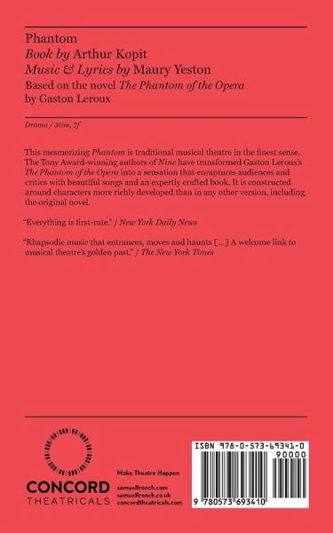 30m, 7f, plus ensemble (doubling possible.) / Ints./exts.This mesmerizing Phantom is traditional musical theatre in the finest sense. The Tony award winning authors of Nine have transformed Gaston Leroux' The Phantom of the Opera into a sensation that enraptures audiences and critics with beautiful songs and an expertly crafted book. It is constructed around characters more richly developed than in any other version, including the original novel. Everything is first rate.- N.Y. Daily NewsRhapsodic music that entrances, moves and haunts...A welcome link to musical theatre's golden past.- The New York Times