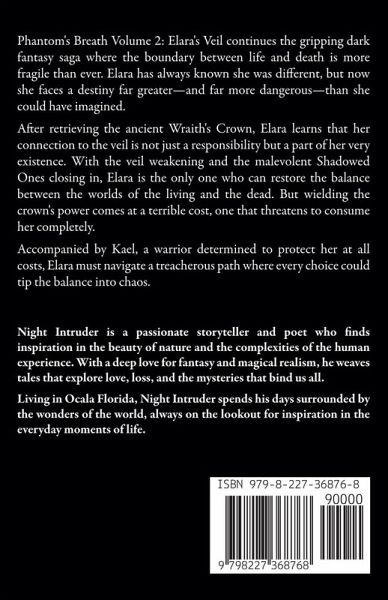 Phantom's Breath Volume 2: Elara's Veil continues the gripping dark fantasy saga where the boundary between life and death is more fragile than ever. Elara has always known she was different, but now she faces a destiny far greater-and far more dangerous-than she could have imagined. After retrieving the ancient Wraith's Crown, Elara learns that her connection to the veil is not just a responsibility but a part of her very existence. With the veil weakening and the malevolent Shadowed Ones closing in, Elara is the only one who can restore the balance between the worlds of the living and the dead. But wielding the crown's power comes at a terrible cost, one that threatens to consume her completely. Accompanied by Kael, a warrior determined to protect her at all costs, Elara must navigate a treacherous path where every choice could tip the balance into chaos. As she journeys into the heart of the veil itself, Elara discovers ancient secrets, new enemies, and the true meaning of sacrifice. Torn between saving the world and losing herself, Elara must decide if she can shoulder the burden of being the veil's keeper-or if the price is too great to bear. In this thrilling sequel, the stakes are higher, the enemies are darker, and Elara's fate becomes ever more entwined with the forces that seek to destroy everything she holds dear.