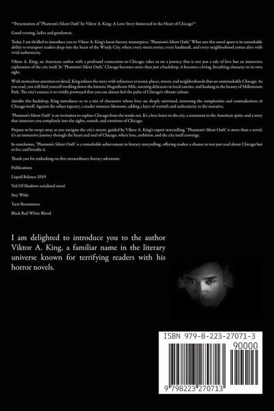 **Presentation of "Phantom's Silent Oath" by Viktor A. King: A Love Story Immersed in the Heart of Chicago** Good evening, ladies and gentlemen, Today, I am thrilled to introduce you to Viktor A. King's latest literary masterpiece, "Phantom's Silent Oath." What sets this novel apart is its remarkable ability to transport readers deep into the heart of the Windy City, where every street corner, every landmark, and every neighborhood comes alive with vivid authenticity. Viktor A. King, an American author with a profound connection to Chicago, takes us on a journey that is not just a tale of love but an immersive exploration of the city itself. In "Phantom's Silent Oath," Chicago becomes more than just a backdrop; it becomes a living, breathing character in its own right. With meticulous attention to detail, King infuses the story with references to iconic places, streets, and neighborhoods that are unmistakably Chicago. As you read, you will find yourself strolling down the historic Magnificent Mile, savoring delicacies in local eateries, and basking in the beauty of Millennium Park. The city's essence is so vividly portrayed that you can almost feel the pulse of Chicago's vibrant culture. Amidst this backdrop, King introduces us to a trio of characters whose lives are deeply entwined, mirroring the complexities and contradictions of Chicago itself. Against the urban tapestry, a tender romance blossoms, adding a layer of warmth and authenticity to the narrative. "Phantom's Silent Oath" is an invitation to explore Chicago from the inside out. It's a love letter to the city, a testament to the American spirit, and a story that immerses you completely into the sights, sounds, and emotions of Chicago. Prepare to be swept away as you navigate the city's streets, guided by Viktor A. King's expert storytelling. "Phantom's Silent Oath" is more than a novel; it's an immersive journey through the heart and soul of Chicago, where love, ambition, and the city itself converge. In conclusion, "Phantom's Silent Oath" is a remarkable achievement in literary storytelling, offering readers a chance to not just read about Chicago but to live and breathe it. Thank you for embarking on this extraordinary literary adventure. Publications Liquid Balance 2019 Veil Of Shadows serialized novel Stay Woke Tacit Resonances Black Red White Blood Viktor A. King I am delighted to introduce you to the author Viktor A. King, a familiar name in the literary universe known for terrifying readers with his horror novels. However, today we will venture into new territory for this New York-based author: the world of romance novels. Viktor A. King was born and raised in New York City, a metropolis notorious for its frenetic energy and rich literary landscape. King gained fame through his psychological horror stories, often set in the dark and sinister streets of his beloved hometown. His horror novels have enthralled readers with their gripping suspense and unsettling subtext.