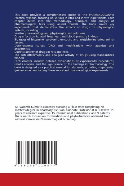 This book provides a comprehensive guide to the PHARMACOLOGY-II Practical syllabus, focusing on various in-vitro and in-vivo experiments. Each chapter delves into the methodology, principles, and analysis of pharmacological tests using animal models. The book covers key experiments that demonstrate the effects of drugs on physiological systems, including:In-vitro pharmacology and physiological salt solutions.Drug effects on isolated frog heart and blood pressure in dogs.Bioassays of histamine, serotonin, oxytocin, and acetylcholine using animal tissues.Dose-response curves (DRC) and modifications with agonists and antagonists.Diuretic activity of drugs in rats and mice.The anti-inflammatory and analgesic activity of drugs using standardized models.Each chapter includes detailed explanations of experimental procedures, results analysis, and the significance of the findings in pharmacology. The book is designed as a practical manual for students, providing step-by-step guidance on conducting these important pharmacological experiments.