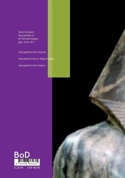 Bernd SchubertBraunstraße 3787700 Memmingen geb. 16.04.1977 Sehr geehrter Herr Gauland, sehr geehrte Frau Dr. Angela Merkel, sehr geehrter Herr Lindner, heute Nacht fuhr ich von der Erfurter Straße, wo meine Eltern wohnen, zur Braunstraße, wo ICH wohne. Ein unbekannter Hundehalter mit einem großen gefährlichen schwarzen Bluthund musste noch an der Christi Auferstehungskirche Gassi gehen. Wieder einmal wurde mir auf meinem Nachhauseweg von meinen Eltern zur Braunstraße Angst eingejagt. Von meinen bisherigen Schreiben wissen Sie ja, sehr geehrte Parteichefs, dass in Memmingen ein Problem mit großen Hunden besteht, die teilweise auch ohne Leine im Stadtgebiet geführt werden. Der Polizei Memmingen habe ich auch schon alles ausführlich geschildert. Ich solle nun die Polizei Memmingen, insbesondere die Chefs der Polizei Memmingen nicht mehr anschreiben. Nur Frau Hartmann, die etwas weiter unter in der Hirarchie der Polizei Memmingen beschäftigt ist. Mir wird nach wie vor von misteriösen Hundehaltern der Stadt Memmingen Angst eingejagt. Nachts in der Zeit von 23 bis 24 Uhr ist das ein Problem. Man weiß nicht, mit was man es zu tun hat.