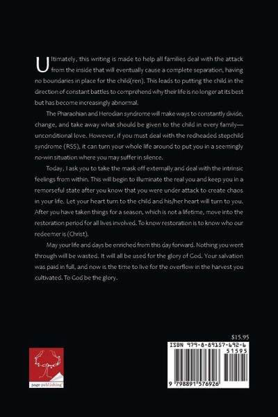 Ultimately, this writing is made to help all families deal with the attack from the inside that will eventually cause a complete separation, having no boundaries in place for the child(ren). This leads to putting the child in the direction of constant battles to comprehend why their life is no longer at its best but has become increasingly abnormal. The Pharaohian and Herodian syndrome will make ways to constantly divide, change, and take away what should be given to the child in every family--unconditional love. However, if you must deal with the redheaded stepchild syndrome (RSS), it can turn your whole life around to put you in a seemingly no-win situation where you may suffer in silence. Today, I ask you to take the mask off externally and deal with the intrinsic feelings from within. This will begin to illuminate the real you and keep you in a remorseful state after you know that you were under attack to create chaos in your life. Let your heart turn to the child and his/her heart will turn to you. After you have taken things for a season, which is not a lifetime, move into the restoration period for all lives involved. To know restoration is to know who our redeemer is (Christ). May your life and days be enriched from this day forward. Nothing you went through will be wasted. It will all be used for the glory of God. Your salvation was paid in full, and now is the time to live for the overflow in the harvest you cultivated. To God be the glory.