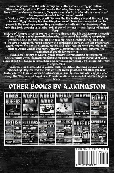 Immerse yourself in the rich history and culture of ancient Egypt with our "Pharaohs of Egypt: 4 in 1" book bundle. Featuring four captivating books on the lives of Tutankhamun, Ramses II, Cleopatra, and Khufu, this bundle is a must-read for anyone interested in the ancient world. In "History of Tutankhamun," you'll discover the fascinating story of the boy king who ruled Egypt during the New Kingdom period. From his unexpected rise to power to the mystery surrounding his untimely death and the discovery of his tomb, this book provides a detailed look at one of the most iconic figures of ancient Egypt. "History of Ramses II" takes you on a journey through the life and accomplishments of one of Egypt's most powerful pharaohs. Learn about his military campaigns, grand building projects, and his role as a diplomatic leader during his reign. In "History of Cleopatra," you'll uncover the captivating story of the last pharaoh of Egypt. Known for her intelligence, beauty, and relationships with powerful men such as Julius Caesar and Mark Antony, Cleopatra's legacy has captured the imagination of people for centuries. Finally, in "History of Khufu," you'll explore the remarkable architectural achievements of the pharaoh responsible for building the Great Pyramid of Giza. Learn about the design, construction, and cultural significance of this incredible feat of engineering. Each book in this bundle is packed with rich detail, stunning visuals, and fascinating insights into the lives of these iconic pharaohs. Whether you're a history buff, a lover of ancient civilizations, or simply someone who enjoys a good story, the "Pharaohs of Egypt: 4 in 1" book bundle is an essential addition to your library. Order your copy today and join us on a journey through time as we explore the history and culture of ancient Egypt through the lives of Tutankhamun, Ramses II, Cleopatra, and Khufu - the pharaohs of Egypt.