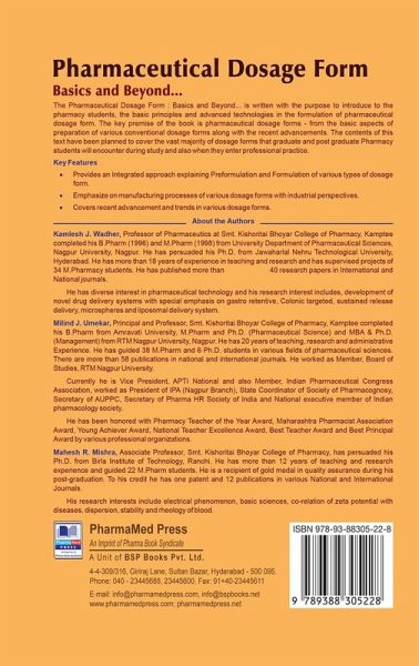 The Pharmaceutical Dosage Form : Basics and Beyond... is written with the purpose to introduce to the pharmacy students, the basic principles and advanced technologies in the formulation of pharmaceutical dosage form. The key premise of the book is pharmaceutical dosage forms - from the basic aspects of preparation of various conventional dosage forms along with the recent advancements. The contents of this text have been planned to cover the vast majority of dosage forms that graduate and post graduate Pharmacy students will encounter during study and also when they enter professional practice. Key Features • Provides an Integrated approach explaining Preformulation and Formulation of various types of dosage form. • Emphasize on manufacturing processes of various dosage forms with industrial perspectives. • Covers recent advancement and trends in various dosage forms.