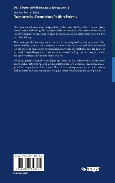 This book provides a comprehensive review in the design of formulations to meet the needs of older patients. An overview of the key clinical, social and pharmaceutical factors affecting medication optimization, safety and acceptability in older adults is included, followed by patient-centric considerations including regulatory requirements, dosage form design and human factor studies.
