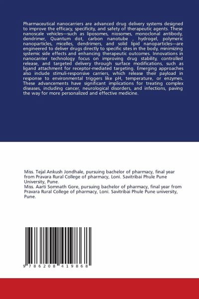 Pharmaceutical nanocarriers are advanced drug delivery systems designed to improve the efficacy, specificity, and safety of therapeutic agents. These nanoscale vehicles-such as liposomes, niosomes, monoclonal antibody, dendrimer, Quantum dot, carbon nanotube , hydrogel, polymeric nanoparticles, micelles, dendrimers, and solid lipid nanoparticles-are engineered to deliver drugs directly to specific sites in the body, minimizing systemic side effects and enhancing therapeutic outcomes. Innovations in nanocarrier technology focus on improving drug stability, controlled release, and targeted delivery through surface modifications, such as ligand attachment for receptor-mediated targeting. Emerging approaches also include stimuli-responsive carriers, which release their payload in response to environmental triggers like pH, temperature, or enzymes. These advancements have significant implications for treating complex diseases, including cancer, neurological disorders, and infections, paving the way for more personalized and effective medicine.