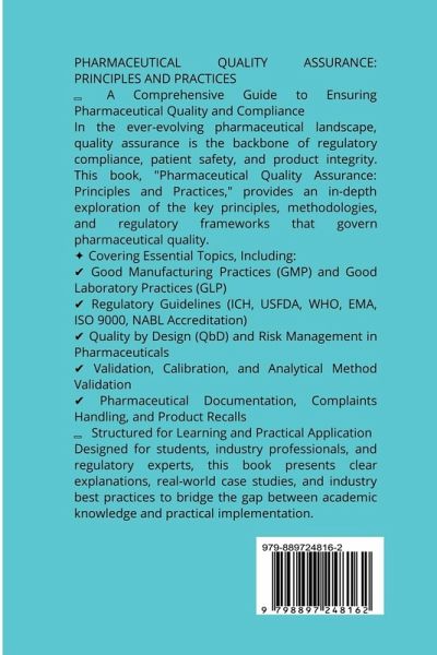 A Comprehensive Guide to Ensuring Pharmaceutical Quality and Compliance This book, "Pharmaceutical Quality Assurance: Principles and Practices," provides an in-depth exploration of the key principles, methodologies, and regulatory frameworks that govern pharmaceutical quality. ✦ Covering Essential Topics, Including: ✔ Good Manufacturing Practices (GMP) and Good Laboratory Practices (GLP) ✔ Regulatory Guidelines (ICH, USFDA, WHO, EMA, ISO 9000, NABL Accreditation) ✔ Quality by Design (QbD) and Risk Management in Pharmaceuticals ✔ Validation, Calibration, and Analytical Method Validation ✔ Pharmaceutical Documentation, Complaints Handling, and Product Recalls