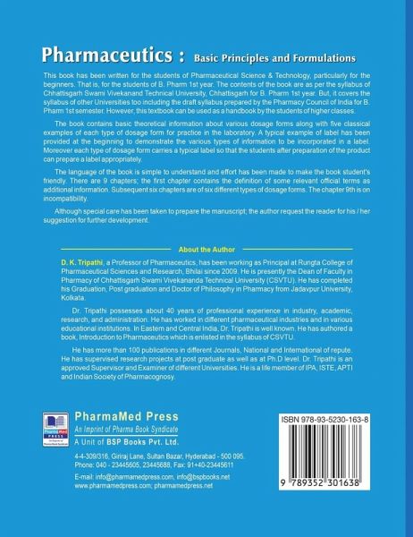The book contains basic theoretical information about various dosage forms along with five classical examples of each type of dosage form for practice in the laboratory. A typical example of label has been provided at the beginning to demonstrate the various types of information to be incorporated in a label. Moreover each type of dosage form carries a typical label so that the students after preparation of the product can prepare a label appropriately. The language of the book is simple to understand and effort has been made to make the book student's friendly. There are 9 chapters; the first chapter contains the definition of some relevant official terms as additional information. Subsequent six chapters are of six different types of dosage forms. The chapter 9th is on incompatibility.