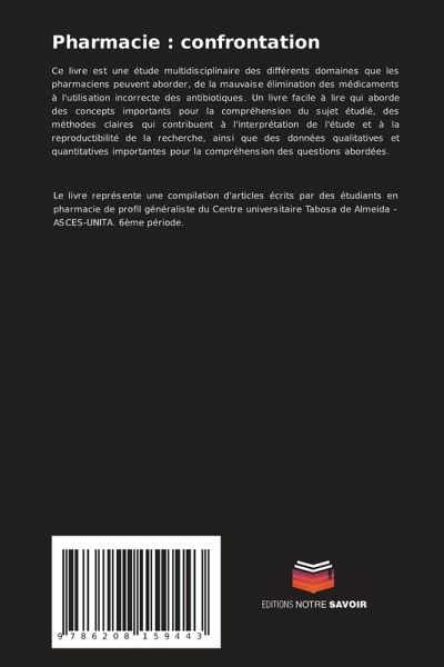 Ce livre est une étude multidisciplinaire des différents domaines que les pharmaciens peuvent aborder, de la mauvaise élimination des médicaments à l'utilisation incorrecte des antibiotiques. Un livre facile à lire qui aborde des concepts importants pour la compréhension du sujet étudié, des méthodes claires qui contribuent à l'interprétation de l'étude et à la reproductibilité de la recherche, ainsi que des données qualitatives et quantitatives importantes pour la compréhension des questions abordées.