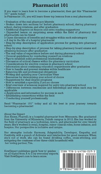 If you want to learn how to become a pharmacist, then get this "Pharmacist 101" guide today! In Pharmacist 101, you will learn these top lessons from a real pharmacist. • Evaluation of the real pharmacy lifestyle • Broken down into sections for before pharmacy school, during pharmacy school, during rotations, and after graduation • Additional chapters on finance and extra reading suggestions • Expanded lesson on surprising areas within the field of pharmacy that pharmacists can be found o Open discussion of benefits and struggles within each subcategory o A day in the life of a hospital pharmacist • Step-by-step description of application process for getting into pharmacy school • Step-by-step description of process for taking pharmacy board exams and obtaining licensure after graduation • The real value of experience before and during pharmacy school • General guidelines for conducting yourself on rotations • Tips to establish solid professional relationships • Discussion of critical classes within the pharmacy curriculum • Considerations for elective courses in pharmacy school • Information about continuing education requirements after graduation • How to handle and prevent mistakes within healthcare • Balancing life and professional obligations • Writing and updating your Curriculum Vitae • Resources for determining your school of choice • Suggestions for dual degree programs • How to establish a specialty, if you so choose • Brief overview of sciences required for entry into pharmacy school • Differences between residencies and fellowships and when each may be applicable o Application and information for success in each • Establishing connections within the field • Conducting yourself professionally Read "Pharmacist 101" today and all the best in your journey towards becoming a pharmacist! About the Expert Ann Klemz, PharmD, is a hospital pharmacist from Minnesota. She graduated from the University of Minnesota, Duluth campus in 2012. She has worked in the field of pharmacy as a technician, intern, and pharmacist for over twenty years. She’s worked in retail, hospital, minor clinical roles, home infusion, and hospice. Her perspective is inclusive and unique. Her strengths include Harmony, Adaptability, Developer, Empathy, and Positivity, with a punch of Activator and Intellection for good measure. When she’s not at work, she can be found drinking coffee, cross-stitching, and mitigating the craziness of her three-child household with her loving partner, Tim. HowExpert.com publishes quick ‘how to’ guides in all topics from A to Z by everyday experts.