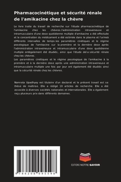 Le livre traite du travail de recherche sur l'étude pharmacocinétique de l'amikacine chez les chèvres.l'administration intraveineuse et intramusculaire d'une dose quotidienne multiple d'amikacine a été effectuée et la concentration du médicament a été estimée dans le plasma et l'urineà différents intervalles de temps.les paramètres cinétiques et le régime posologique de l'amikacine sur la première et la dernière dose après l'administration intraveineuse et intramusculaire d'une dose quotidienne multiple ontégalement été étudiés, ainsi que l'étude dela sécurité rénale chez les chèvres.Les paramètres cinétiques et le régime posologique de l'amikacine à la première et à la dernière dose après une administration intraveineuse et intramusculaire multiple une fois par jour ont également été étudiés ainsi que la sécurité rénale chez les chèvres.
