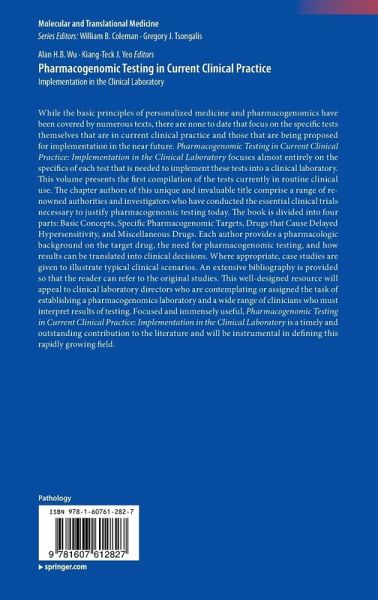 From the reviews: "The book is written for clinical laboratory directors 'contemplating or assigned the task of establishing a pharmacogenomics laboratory,' pharmacologists, and interested clinicians who may have to interpret results. This book also would be of interest to ... allied health practitioners, regulators, reimbursers, and test device manufacturers. ... The writing is concise, clear, and accessible for what might be considered a complex topic. ... Get this book if you want a quick, concise, and fascinating read about the current world and use of pharmacogenomic testing." (Valerie L. Ng, Doody's Review Service, May, 2011)