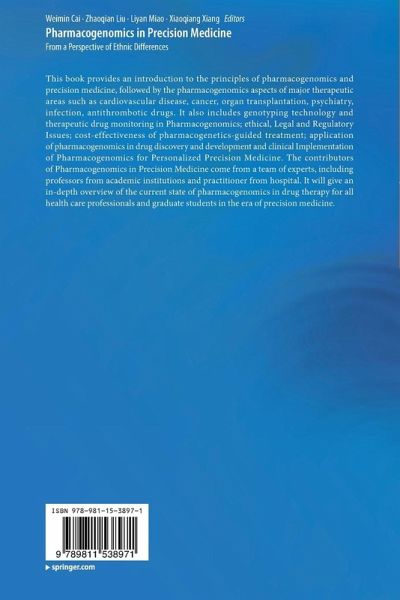 Chapter 1. Introduction and Principles of Pharmacogenomics and Precision medicine.- Chapter 2. Pharmacogenomics in Cardiovascular Diseases.- Chapter 3. Pharmacogenomics of Antitumor Chemotherapeutic Agents.- Chapter 4. Pharmacogenomics of Antitumor Targeted Agent and Immunotherapy.- Chapter 5. Pharmacogenomics of Immunosuppressant.- Chapter 6. Pharmacogenomics of Psychiatric drugs.- Chapter 7. Pharmacogenomics of Anti-Infective Agents.- Chapter 8. Pharmacogenomics of Antithrombotic drugs.- Chapter 9. Pharmacogenomics in Therapeutic Drug Monitoring.- Chapter 10. Pharmacomicrobiomics.- Chapter 11. Genotyping technology in Pharmacogenomics.- Chapter 12. The Ethical, Legal and Regulatory Issues Associated with Pharmacogenomics.- Chapter 13. Cost-effectiveness of pharmacogenetic-guided treatment.- Chapter 14. Application of pharmacogenomics in drug discovery and development.- Chapter 15. Barriers and Solutions in Clinical Implementation of Pharmacogenomics for Personalized Precision Medicine.