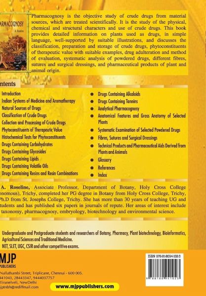 Pharmacognosy is the objective study of crude drugs from materialsources, which are treated scientifically. It is the study of the physical,chemical and structural characters and use of crude drugs. This bookprovides detailed information on plants used as drugs, in simplelanguage, well-supported by suitable illustrations, and discusses theclassification, preparation and storage of crude drugs,phytoconstituents of therapeutic value with suitable examples, drug adulteration and method of evaluatio