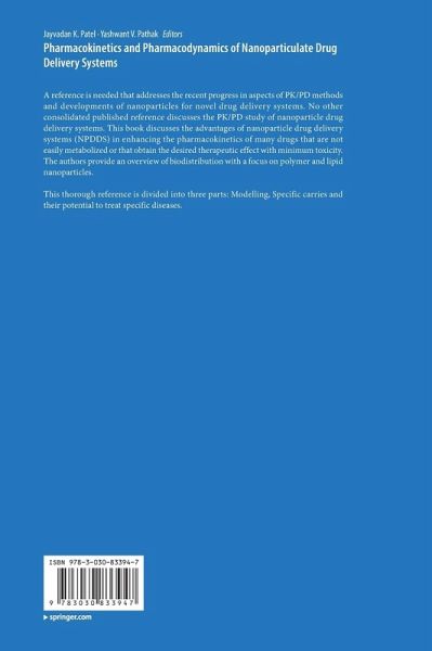 Part 1-Modelling of PK/PD for NPDDS.- Introduction to Nanoparticulate Drug Delivery Systems.- Nanoparticle Properties Affecting Pharmacokinetics of NPDDS.- Models Used for Biopharmaceutical Evaluation of NPDDS.- Models Used in the Pharmacokinetic Evaluation of NPDDS.- Models Used in the Pharmacodynamic Evaluation of NPDDS.- Preclinical Animal Models For Experimental Design of Pharmacokinetic Studies of NPDDS.- Pharmacokinetic Modelling Program (PKMP).- Part 2-PK/PD for Specific Nanocarriers.- Pharmacokinetic and Pharmacodynamics of Liposomal Nanoparticles.- Pharmacokinetics of Polymer Matrix Drugs (NPDDS).- Pharmacokinetics of Long-Circulating NPDDS.- Metallic Gold Nanoparticles in vivo Pharmacokinetics and X-ray Contrast imaging Studies.- Muco-adhesive NPDDS In Vitro and Pharmacokinetics Studies.- Pharmacokinetic and Tissue Distribution Study of Solid Lipid Nanoparticles.- Factors Affecting the Clearance and Biodistribution of Polymeric Nanoparticles.- PKPD of PLGA-PEG-PLGA Triblock CoPolymeric Micelles.- Part 3-PKPD in Diseased Conditions for NPDDS.- Bridging Bio-Nanoscience and Cancer Nanomedicine.- Clearance Pathways and Tumor Targeting of Imaging Nanoparticles for Diagnostics.- PLGA Nanoparticles for Oral Delivery-Nephrotoxicity and Pharmacokinetic Studies.- Pharmacokinetics of Nanoparticle Systems for Pulmonary Delivery.- In vivo Biodistribution and Pharmacokinetic Studies of NPDDS for Brain Targeting.- Enhanced Bioavailability and Intestinal Uptake Nanoparticles After Oral Delivery.- Nanoparticle Pharmacokinetic Profiling In Vivo Using Magnetic Resonance Imaging.