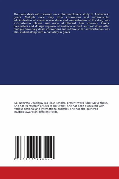 The book deals with research on a pharmacokinetic study of Amikacin in goats. Multiple once daily dose intravenous and intramuscular administration of amikacin was done and concentration of the drug was estimated in plasma and urine at different time intervals. Kinetic parameters and dosage regimen of amikacin on first and last doses after multiple once-daily doses intravenous and intramuscular administration was also studied along with renal safety in goats.