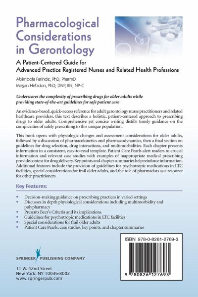 Underscores the complexity of prescribing drugs for older adults while providing state-of-the-art guidelines for safe patient care. An evidence-based, quick-access reference for adult gerontology nurse practitioners and related providers, this text describes a holistic, patient-centered approach to prescribing drugs to older adults.