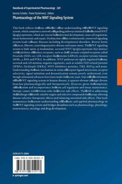 This book reflects the state of the art of our understanding of the WNT signaling system, which comprises a network of signaling pathways initiated by the secreted WNT lipoglycoproteins, which are crucial for embryonal development, stem cell regulation, tissue homeostasis and repair. Dysfunction of this evolutionarily conserved signaling system leads to many diseases including developmental disorders, diverse forms of cancer, fibrosis, neurodegenerative disease and many more. The WNT signaling system is built upon 19 mammalian, secreted WNT lipoglycoproteins that interact with a plethora of distinct receptors, such as the G protein-coupled receptors called Frizzleds (FZD1-10), LDL receptor-like proteins (LRP5/6), receptor tyrosine kinases (ROR1, 2, RYK and PTK7). In addition, WNT pathways are tightly regulated by many secreted and cell-intrinsic negative regulators, such as soluble FZD-related proteins (SFRPs), Dickkopfs (DKKs), WNT-inhibitory proteins, TIKI, RNF43 and more. Understanding the basic mechanism in terms of receptor-ligand interaction, receptor selectivity, signal initiation and desensitization remain poorly understood, even though substantial advances have been made the recent years. Due to the involvement of the WNT signaling system in human disease, it appears obvious to target diverse branches pharmacologically and therapeutically. However, given the complexity of the system and its importance for stem cell regulation and tissue maintenance, therapy comes with obvious risks for severe side effects. The field is addressing the challenge to identify suitable targets and selective compounds for therapy allowing disease-selective therapeutic effects and balancing unwanted side effects. This book summarizes the current understanding of the basic and applied pharmacology in the WNT signaling system and bridges disciplines such as pharmacology, physiology, neurosciences, oncology and drug development.