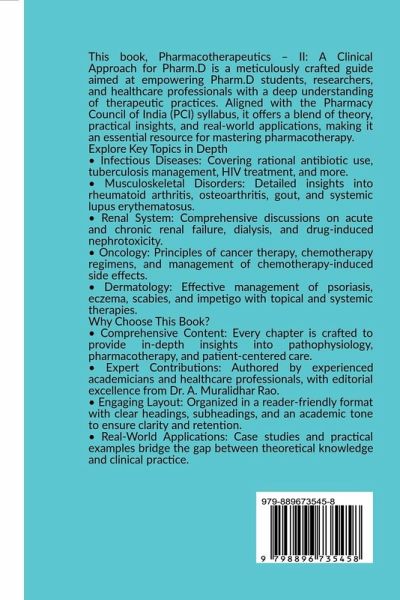 This book, Pharmacotherapeutics - II: A Clinical Approach for Pharm.D, is a meticulously crafted guide aimed at empowering Pharm.D students, researchers, and healthcare professionals with a deep understanding of therapeutic practices. Aligned with the Pharmacy Council of India (PCI) syllabus, it offers a blend of theory, practical insights, and real-world applications, making it an essential resource for mastering pharmacotherapy. Explore Key Topics in Depth Infectious Diseases: Covering rational antibiotic use, tuberculosis management, HIV treatment, and more. Musculoskeletal Disorders: Detailed insights into rheumatoid arthritis, osteoarthritis, gout, and systemic lupus erythematosus. Renal System: Comprehensive discussions on acute and chronic renal failure, dialysis, and drug-induced nephrotoxicity. Oncology: Principles of cancer therapy, chemotherapy regimens, and management of chemotherapy-induced side effects. Dermatology: Effective management of psoriasis, eczema, scabies, and impetigo with topical and systemic therapies. Why Choose This Book? Comprehensive Content: Every chapter is crafted to provide in-depth insights into pathophysiology, pharmacotherapy, and patient-centered care. Engaging Layout: Organized in a reader-friendly format with clear headings, subheadings, and an academic tone to ensure clarity and retention.