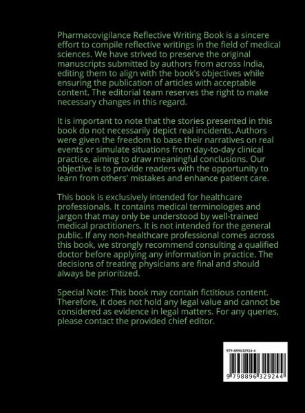 Pharmacovigilance Reflective Writing Book is a sincere effort to compile reflective writings in the field of medical sciences. We have strived to preserve the original manuscripts submitted by authors from across India, editing them to align with the book's objectives while ensuring the publication of articles with acceptable content. The editorial team reserves the right to make necessary changes in this regard. It is important to note that the stories presented in this book do not necessarily depict real incidents. Authors were given the freedom to base their narratives on real events or simulate situations from day-to-day clinical practice, aiming to draw meaningful conclusions. Our objective is to provide readers with the opportunity to learn from others' mistakes and enhance patient care. This book is exclusively intended for healthcare professionals. It contains medical terminologies and jargon that may only be understood by well-trained medical practitioners. It is not intended for the general public. If any non-healthcare professional comes across this book, we strongly recommend consulting a qualified doctor before applying any information in practice. The decisions of treating physicians are final and should always be prioritized. Special Note: This book may contain fictitious content. Therefore, it does not hold any legal value and cannot be considered as evidence in legal matters. For any queries, please contact the provided chief editor.