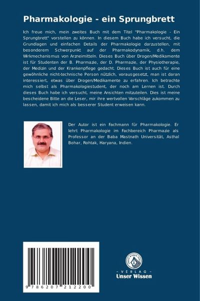 Ich freue mich, mein zweites Buch mit dem Titel "Pharmakologie - Ein Sprungbrett" vorstellen zu können. In diesem Buch habe ich versucht, die Grundlagen und einfachen Details der Pharmakologie darzustellen, mit besonderem Schwerpunkt auf der Pharmakodynamik, d.h. dem Wirkmechanismus von Arzneimitteln. Dieses Buch über Drogen/Medikamente ist für Studenten der B. Pharmazie, der D. Pharmazie, der Physiotherapie, der Medizin und der Krankenpflege gedacht. Dieses Buch ist auch für eine gewöhnliche nicht-technische Person nützlich, vorausgesetzt, man ist daran interessiert, etwas über Drogen/Medikamente zu erfahren. Ich betrachte mich selbst als Pharmakologiestudent, der noch am Lernen ist. Durch dieses Buch habe ich versucht, meine Ansichten mitzuteilen. Dies ist meine bescheidene Bitte an die Leser, mir ihre wertvollen Vorschläge zukommen zu lassen, damit ich mich als besserer Student erweisen kann.