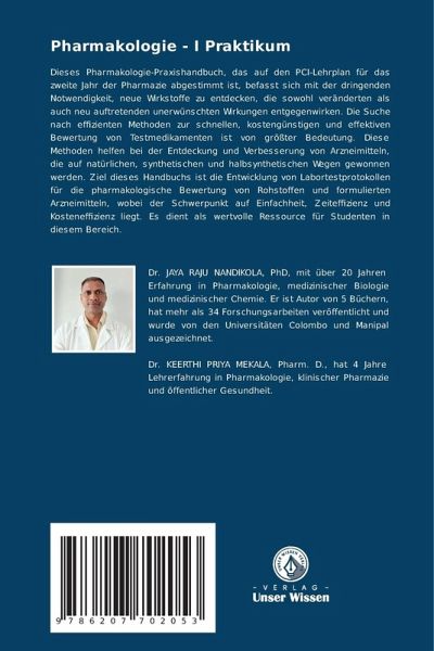 Dieses Pharmakologie-Praxishandbuch, das auf den PCI-Lehrplan für das zweite Jahr der Pharmazie abgestimmt ist, befasst sich mit der dringenden Notwendigkeit, neue Wirkstoffe zu entdecken, die sowohl veränderten als auch neu auftretenden unerwünschten Wirkungen entgegenwirken. Die Suche nach effizienten Methoden zur schnellen, kostengünstigen und effektiven Bewertung von Testmedikamenten ist von größter Bedeutung. Diese Methoden helfen bei der Entdeckung und Verbesserung von Arzneimitteln, die auf natürlichen, synthetischen und halbsynthetischen Wegen gewonnen werden. Ziel dieses Handbuchs ist die Entwicklung von Labortestprotokollen für die pharmakologische Bewertung von Rohstoffen und formulierten Arzneimitteln, wobei der Schwerpunkt auf Einfachheit, Zeiteffizienz und Kosteneffizienz liegt. Es dient als wertvolle Ressource für Studenten in diesem Bereich.