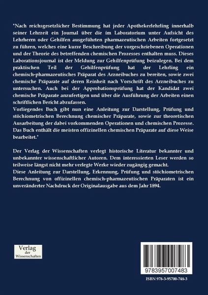 Diese Anleitung zur Darstellung, Erkennung, Prüfung und stöchiometrischen Berechnung von offizinellen chemisch-pharmazeutischen Präparaten ist ein unveränderter Nachdruck der Originalausgabe aus dem Jahr 1894.