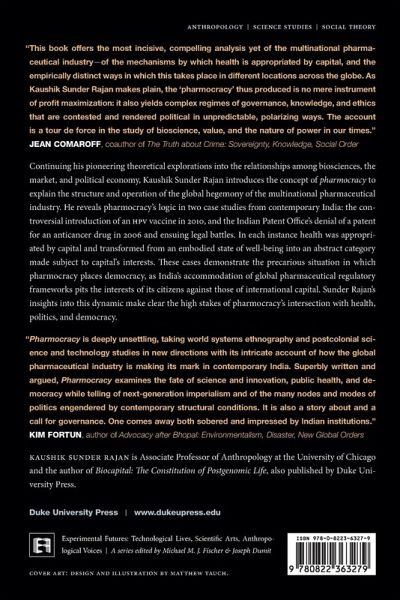 Continuing his pioneering theoretical explorations into the relationships among biosciences, the market, and political economy, Kaushik Sunder Rajan introduces the concept of pharmocracy to explain the structure and operation of the global hegemony of the multinational pharmaceutical industry. He reveals pharmocracy's logic in two case studies from contemporary India: the controversial introduction of an HPV vaccine in 2010, and the Indian Patent Office's denial of a patent for an anticancer drug in 2006 and ensuing legal battles. In each instance health was appropriated by capital and transformed from an embodied state of well-being into an abstract category made subject to capital's interests. These cases demonstrate the precarious situation in which pharmocracy places democracy, as India's accommodation of global pharmaceutical regulatory frameworks pits the interests of its citizens against those of international capital. Sunder Rajan's insights into this dynamic make clear the high stakes of pharmocracy's intersection with health, politics, and democracy.
