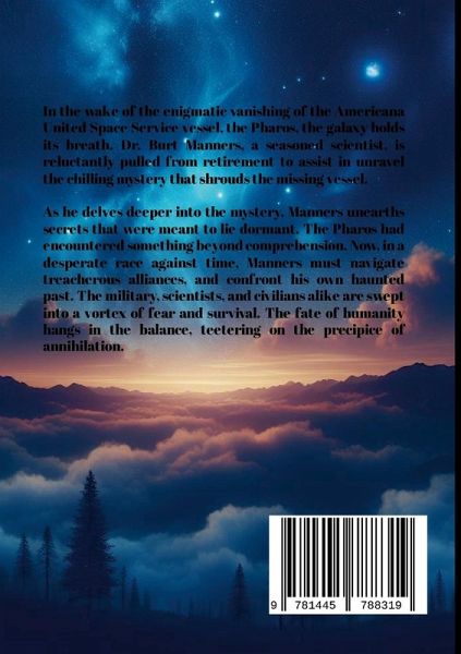 In the wake of the enigmatic vanishing of the Americana United Space Service vessel, the Pharos, the galaxy holds its breath. Dr. Burt Manners, a seasoned scientist, is reluctantly pulled from retirement to assist in unravel the chilling mystery that shrouds the missing vessel. As he delves deeper into the mystery, Manners unearths secrets that were meant to lie dormant. The Pharos had encountered something beyond comprehension. Now, in a desperate race against time, Manners must navigate treacherous alliances, and confront his own haunted past. The military, scientists, and civilians alike are swept into a vortex of fear and survival. The fate of humanity hangs in the balance, teetering on the precipice of annihilation.