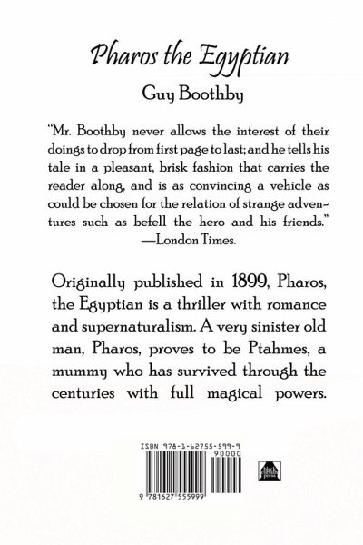 Originally published in 1899, Pharos, the Egyptian is a thriller with romance and supernaturalism. A very sinister old man, Pharos, proves to be Ptahmes, a mummy who has survived through the centuries with full magical powers. "Mr. Boothby never allows the interest of their doings to drop from first page to last; and he tells his tale in a pleasant, brisk fashion that carries the reader along, and is as convincing a vehicle as could be chosen for the relation of strange adventures such as befell the hero and his friends."-London Times.