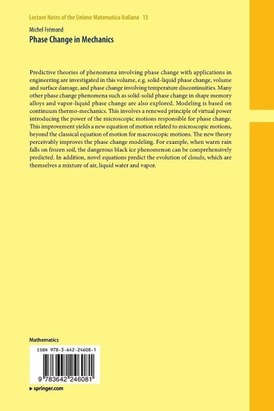 Predictive theories of phenomena involving phase change with applications in engineering are investigated in this volume, e.g.solid-liquid phase change, volume and surface damage, and phase change involving temperature discontinuities. Many other phase change phenomena such as solid-solid phase change in shape memory alloys and vapor-liquid phase change are also explored.Modeling is based on continuum thermo-mechanics. This involves a renewed principle of virtual power introducing the power of the microscopic motions responsible for phase change. This improvement yields a new equation of motion related to microscopic motions, beyond the classical equation of motion for macroscopic motions. The new theory sensibly improves the phase change modeling. For example, when warm rain falls on frozen soil, the dangerous black ice phenomenon can be comprehensively predicted. In addition, novel equations predict the evolution of clouds, which are themselves a mixture of air, liquid water and vapor.