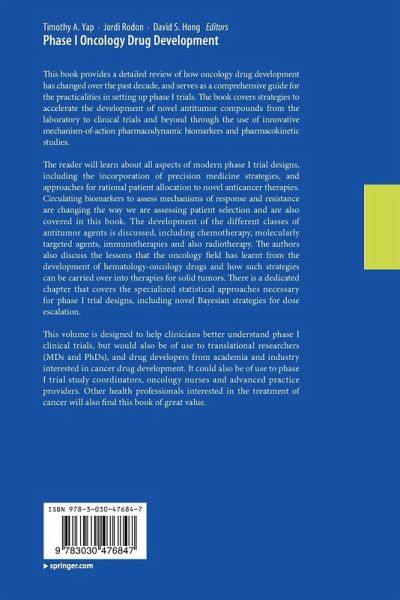 The reader will learn about all aspects of modern phase I trial designs, including the incorporation of precision medicine strategies, and approaches for rational patient allocation to novel anticancer therapies. Circulating biomarkers to assess mechanisms of response and resistance are changing the way we are assessing patient selection and are also covered in this book. The development of the different classes of antitumor agents are discussed, including chemotherapy, molecularly targeted agents, immunotherapies and also radiotherapy. Theauthors also discuss the lessons that the oncology field has learnt from the development of hematology-oncology drugs and how such strategies can be carried over into therapies for solid tumors. There is a dedicated chapter that covers the specialized statistical approaches necessary for phase I trial designs, including novel Bayesian strategies for dose escalation.