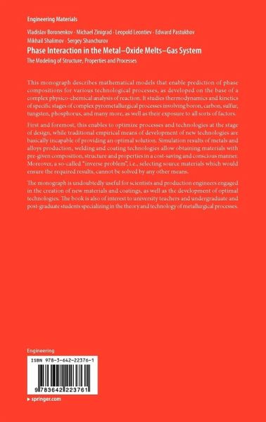 This monograph describes mathematical models that enable prediction of phase compositions for various technological processes, as developed on the base of a complex physico-chemical analysis of reaction. It studies thermodynamics and kinetics of specific stages of complex pyrometallurgical processes involving boron, carbon, sulfur, tungsten, phosphorus, and many more, as well as their exposure to all sorts of factors.