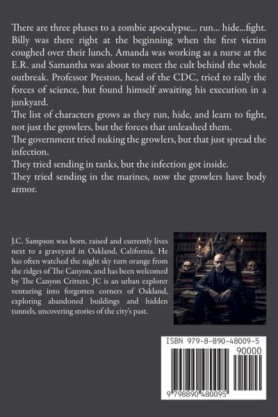 There are three phases to a zombie apocalypse... run... hide...fight. Billy was there right at the beginning when the first victim coughed over their lunch. Amanda was working as a nurse at the E.R. and Samantha was about to meet the cult behind the whole outbreak. Professor Preston, head of the CDC, tried to rally the forces of science, but found himself awaiting his execution in a junkyard. The list of characters grows as they run, hide, and learn to fight, not just the growlers, but the forces that unleashed them. The government tried nuking the growlers, but that just spread the infection. They tried sending in tanks, but the infection got inside. They tried sending in the marines, now the growlers have body armor.