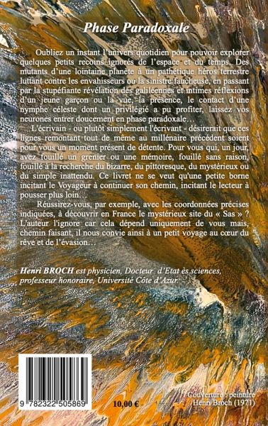 Oubliez un instant l'univers quotidien pour pouvoir explorer quelques petits recoins ignorés de l'espace et du temps. Des mutants d'une lointaine planète à un pathétique héros terrestre luttant contre les envahisseurs ou la sinistre faucheuse, en passant par la stupéfiante révélation des galiléennes et intimes réflexions d'un jeune garçon ou la vue, la présence, le contact d'une nymphe céleste dont un privilégié a pu profiter, laissez vos neurones entrer doucement en phase paradoxale...L'écrivain - ou plutôt simplement l'écrivant - désirerait que ces lignes remontant tout de même au millénaire précédent soient pour vous un moment présent de détente. Pour vous qui, un jour, avez fouillé un grenier ou une mémoire, fouillé sans raison, fouillé à la recherche du bizarre, du pittoresque, du mystérieux ou du simple inattendu. Ce livret ne se veut qu'une petite borne incitant le Voyageur à continuer son chemin, incitant le lecteur à pousser plus loin...Réussirez-vous, par exemple, avec les coordonnées précises indiquées par l'auteur, à découvrir en France le mystérieux - mais réel !! - site archéologique du "Sas" ?... (si vous réussissez réellement à le trouver, faites parvenir à l'auteur une photo du site avec vous-même sur place à l'emplacement du "Sas").Réussirez-vous dans ce jeu de piste ?... L'auteur l'ignore car cela dépend uniquement de vous mais, chemin faisant, il nous convie ainsi à un petit voyage au coeur du rêve et de l'évasion...