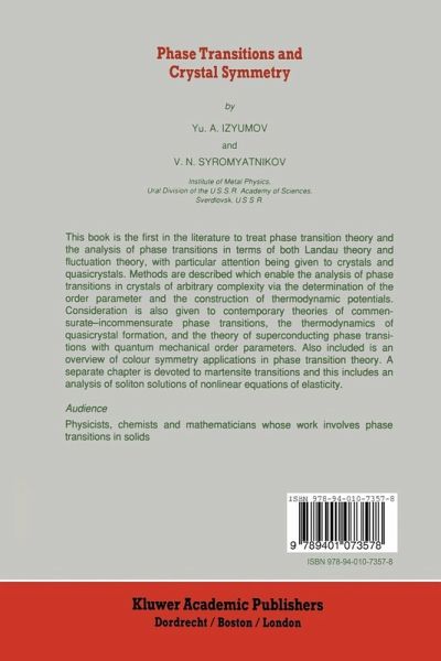 1. Introduction to Phenomenological Phase Transition Theory.- 1. Fundamentals of Landau's Thermodynamic Theory.- 2. Prerequisites on Space-group Representations.- References.- 2. Physical Realization of the Order Parameters at a Microscopic Level of Description.- 3. Tensor Representation of the Space Group on a Basis of Localized Atomic Functions.- 4. Permutational Representation and its Basis.- 5. Vector Representation and its Basis.- 6. Pseudovector Representation and its Basis.- References.- 3. Symmetry Change at Phase Transitions.- 7. Change in Translational Symmetry.- 8. The Total Symmetry Change.- 9. Domains.- 10. The Paraphase.- References.- 4. Analysis of the Thermodynamic Potential.- Invariant Expressions of the Thermodynamic Potential.- 12. Integral Rational Basis of Invariants.- 13. Examples of the Construction of an IRBI.- 14. Irreducible Representation Images and Thermodynamic Potential Types.- 14. Irreducible Representation Images and Thermodynamic Potential Types.- 5. Phase Diagrams in the Space of Thermodynamic Potential Parameters.- 15. Theoretical Fundamentals of the Phase Diagram Construction Method.- 16. The One-Component Order Parameter.- 17. The Two-Component Order Parameter.- 19. The Role of the IRBI in the Construction of Phase Diagrams.- 20. Coupling Order Parameters.- References.- 6. Macroscopic Order Parameters.- 21. Transformation Properties of the Order Parameters.- 22. Interplay of Micro- and Macroparameters.- 23. Ferroics.- 24. Non-ferroics.- References.- 7. Phase Transitions in an External Field.- 25. Phase Diagrams.- Features Peculiar to the Temperature Behavior of Susceptibility in the Vicinity of the Second-Order Phase Transition.- Calculation of Susceptibilities for Second-Order Phase Transitions.- Singularities of theSusceptibility in the Vicinity of the First-Order Phase Transition.- 29. Domains in an External Field.- References.- 8. Martensite Transformations.- 30. Reconstructive Structural Transitions.- 31. Thermodynamic Analysis of the Homogeneous State.- 32. Inhomogeneous States in the Vicinity of the Phase Transition.- 33. The Omega Phase.- References.- 9. Incommensurate Periodicity Phases.- 34. General Approach to the Problem.- 35. Phases without Linear Gradient Terms in Free Energy.- 36. Phases with Linear Gradient Terms.- 37. Multi-?-structures.- 38. Incommensurate Phases in External Fields.- 39. The Thermodynamics of Phase Transitions to Incommensurate Phases.- References.- 10. Color Symmetry and its Role in Phase Transition Theory.- 40. Color Symmetry in the Theory of Magnetic Structures.- 41. Supersymmetry of Incommensurate Structures.- 42. Icosahedral Symmetry of Crystals. Quasicrystals.- 43. Color Groups in the Theory of Systems with a Quantum Mechanical Order Parameter.- References.- 11. Fluctuations and Symmetry.- 44. Fundamentals of the Fluctuation Phase Transitions Theory.- 45. Critical Behavior of Anisotropic Systems.- 46. Fluctuation-Induced Break-Down to First-Order Phase Transitions.- 47. Fluctuations in the Vicinity of Multicritical Points.- References.