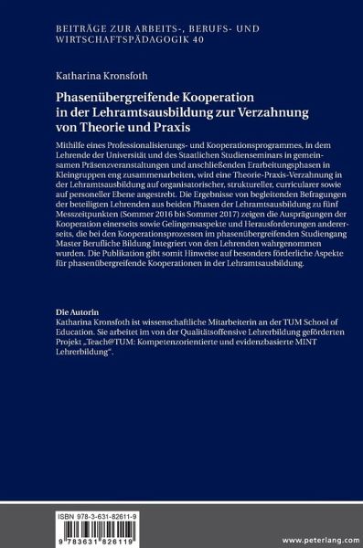 Mithilfe eines Professionalisierungs- und Kooperationsprogrammes, in dem Lehrende der Universität und des Staatlichen Studienseminars in gemeinsamen Präsenzveranstaltungen und anschließenden Erarbeitungsphasen in Kleingruppen eng zusammenarbeiten, wird eine Theorie-Praxis-Verzahnung in der Lehramtsausbildung auf organisatorischer, struktureller, curricularer sowie auf personeller Ebene angestrebt. Die Ergebnisse von begleitenden Befragungen der beteiligten Lehrenden aus beiden Phasen der Lehramtsausbildung zu fünf Messzeitpunkten (Sommer 2016 bis Sommer 2017) zeigen die Ausprägungen der Kooperation einerseits sowie Gelingensaspekte und Herausforderungen andererseits, die bei den Kooperationsprozessen im phasenübergreifenden Studiengang Master Berufliche Bildung Integriert von den Lehrenden wahrgenommen wurden. Die Publikation gibt somit Hinweise auf besonders förderliche Aspekte für phasenübergreifende Kooperationen in der Lehramtsausbildung.