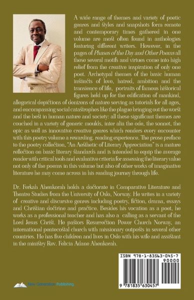 A wide range of themes and variety of poetic genres and styles and snapshots form remote and contemporary times gathered in one volume are most often found in anthologies featuring different writers. However, in the pages of Phases of the Day and Other Poems all these several motifs and virtues come into high relief from the creative inspiration of only one poet. Archetypal themes of the basic human instincts of love, hatred, ambition and the transience of life, portraits of famous historical figures held up for the edification of mankind, allegorical depictions of denizens of nature serving as tutorials for all ages, and encompassing social catastrophes like the plague bringing out the worst and the best in human nature and society: all these significant themes are couched in a variety of generic moulds, inter alia the ode, the sonnet, the epic as well as innovative creative genres which renders every encounter with this poetry volume a rewarding. reading experience. The prose preface to the poetry collection, "An Aesthetic of Literary Appreciation" is a mature reflection on basic literary standards and is intended to equip the average reader with critical tools and evaluative criteria for assessing the literary value not only of the poems in this volume but also of other works of imaginative literature he may come across in his reading journey through life.