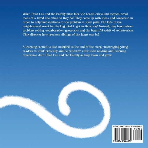 When Phat Cat and the Family must face the health crisis and medical treatment of a loved one, what do they do? They come up with ideas and cooperate in order to help find solutions to the problem in their path. The kids in the neighborhood won't let the Big, Bad C get in their way! Instead, they learn about problem solving, collaboration, generosity and the beautiful spirit of volunteerism. They discover how precious siblings of the heart can be! A learning section is also included at the end of the story, encouraging young readers to think critically and be reflective after their reading and listening experience. Join Phat Cat and the Family as they learn and grow.