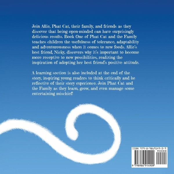Join Allie, Phat Cat, their family, and friends as they discover that being open-minded can have surprisingly delicious results. Book One of Phat Cat and the Family teaches children the usefulness of tolerance, adaptability and adventurousness when it comes to new foods. Allie's best friend, Nicky, discovers why it's important to become more receptive to new possibilities, realizing the inspiration of adopting her best friend's positive attitude. A learning section is also included at the end of the story, inspiring young readers to think critically and be reflective of their story experience. Join Phat Cat and the Family as they learn, grow, and even manage some entertaining mischief!