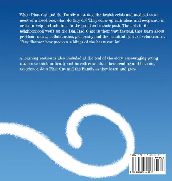 When Phat Cat and the Family must face the health crisis and medical treatment of a loved one, what do they do? They come up with ideas and cooperate in order to help find solutions to the problem in their path. The kids in the neighborhood won't let the Big, Bad C get in their way! Instead, they learn about problem solving, collaboration, generosity and the beautiful spirit of volunteerism. They discover how precious siblings of the heart can be! A learning section is also included at the end of the story, encouraging young readers to think critically and be reflective after their reading and listening experience. Join Phat Cat and the Family as they learn and grow.