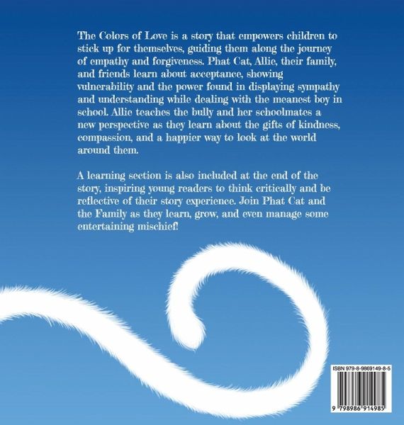 The Colors of Love is a story that empowers children to stick up for themselves, guiding them along the journey of empathy and forgiveness. Phat Cat, Allie, their family, and friends learn about acceptance, showing vulnerability and the power found in displaying sympathy and understanding while dealing with the meanest boy in school. Allie teaches the bully and her schoolmates a new perspective as they learn about the gifts of kindness, compassion, and a happier way to look at the world around them. A learning section is also included at the end of the story, inspiring young readers to think critically and be reflective of their story experience. Join Phat Cat and the Family as they learn, grow, and even manage some entertaining mischief!
